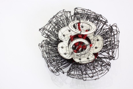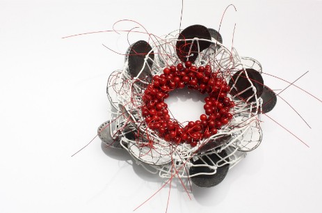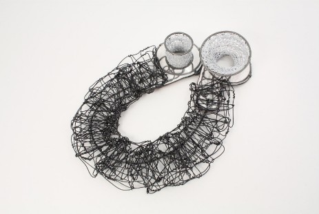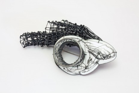 Das grundlegende Gestaltungselement in der Serie ‚Monatsbroschen‘ ist der Trichter.Der Trichter, der bereits in meinen vorangegangenen Arbeiten häufig in Erscheinung tritt, steht für ein ‚künstliches Organ‘, das symbolisch beim Austausch zwischen Träger (innerer Welt) und äußerer Welt unterstützend wirken soll.